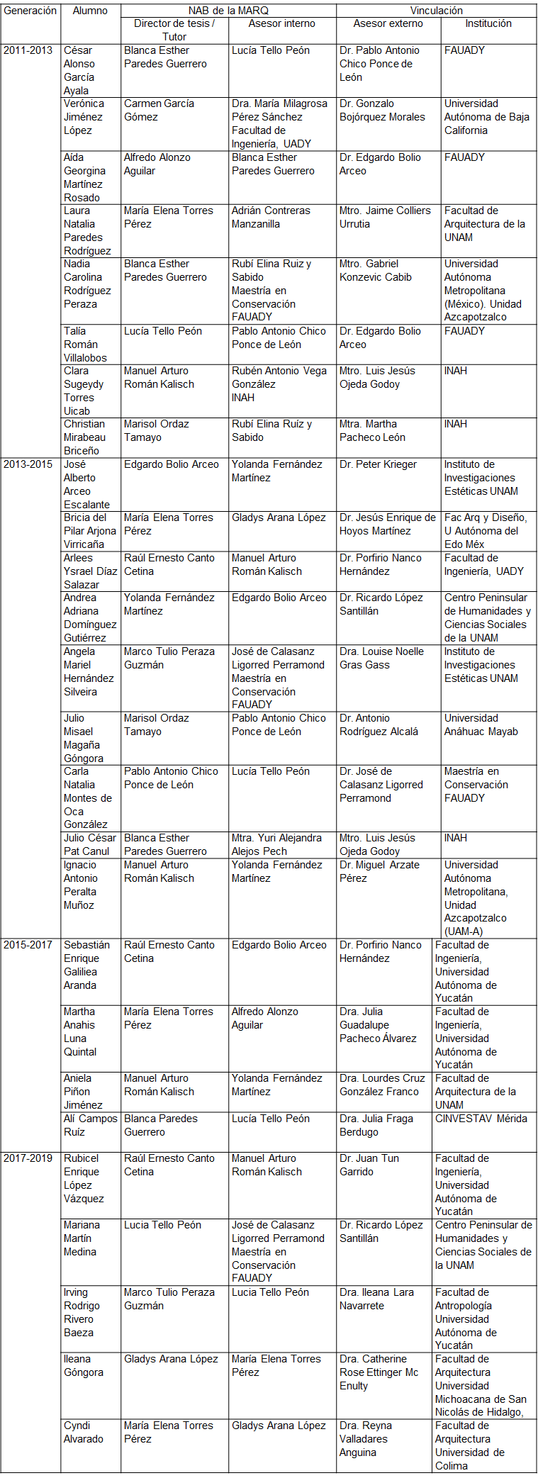 Colaboración y vinculación Las principales actividades de colaboración en donde los estudiantes del programa se han integrado junto con sus profesores, se han dado a partir de 4 maneras: 1. Participando en los proyectos de investigación de sus tutores y seminarios derivados de los mismos. 2. Vinculación nacional con Cuerpos Académicos a través de la cual los estudiantes participan en actividades académicas como lo son seminarios y estancias de movilidad. De igual manera se cuenta con el apoyo de una red de asesores externos. 3. Participación de los profesores del NAB con sus estudiantes en diferentes redes temáticas a nivel internacional y nacional. 4. Relaciones con instituciones académicas regionales y nacionales a través de las cuales se complementa la formación de los estudiantes, toda vez que se cuenta con una red de especialistas que se integran como asesores externos en el último año de la Maestría y forman parte del sínodo. En virtud de lo anterior, se presenta la información desglosada en siguientes Tablas para explicar por cada una de la LGAC los productos que los estudiantes han realizado junto con sus profesores y el tipo de vinculación realizada a través de 3 aspectos: Proyectos de investigación, Red Nacional de Cuerpos Académicos y Redes temáticas Nacionales e Internacionales. Posteriormente se presenta la Tabla sobre la Movilidad Estudiantil por cohorte generacional y por LGAC con el tipo de vinculación, la cual se ha fortalecido a través de la Red Nacional de Cuerpos Académicos. También se presenta la Tabla de Vinculación con Asesores Externos, en donde se precisa la participación de asesores externos miembros de la Red Nacional de Cuerpos Académicos o de instituciones académicas con los cuales los miembros del NAB han mantenido el contacto a lo largo del programa y participando en proyectos de investigación como colaboradores. PRODUCTOS RELEVANTES DE LA VINCULACIÓN 1_LGAC DE DISEÑO, DESARROLLO URBANO Y VIVIENDA